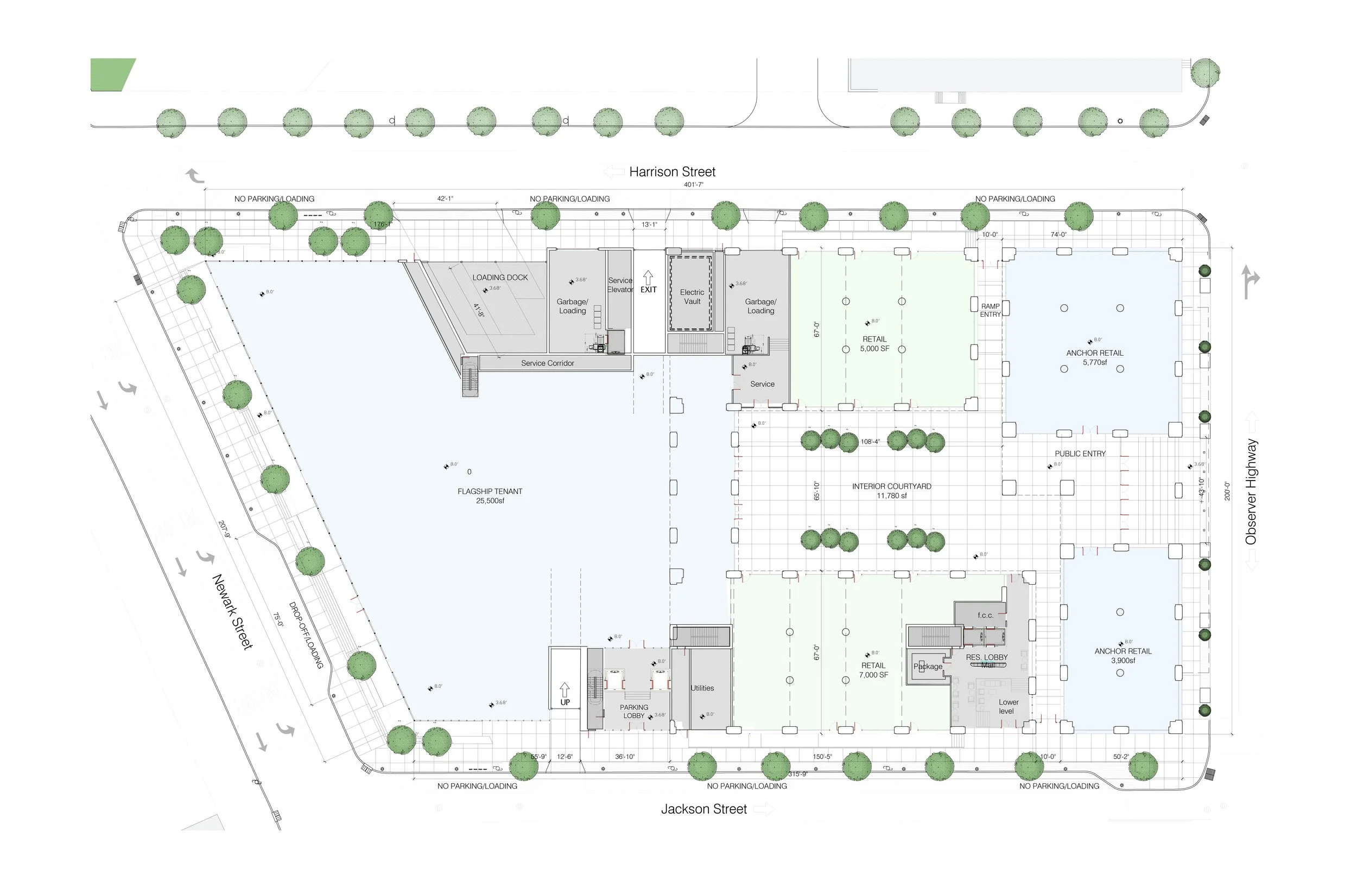 Entering Hoboken from the south, you are faced with this historic site known to house the R. B. Davis Company for manufacturing. The redevelopment of this site preserves the north end building facing the park. A public centralized courtyard is covered to provide year round gatherings. This space is surrounded by an array of retail spaces and restaurants. The south end provides a parking garage that can be utilized by the city to relieve the area of street parking and traffic. 120+ condo apartments are dispersed at the upper floors with large terraces and balconies. A variety of amenities are placed throughout the building for tenant use; this includes a large outdoor amenity terrace including a pool.
